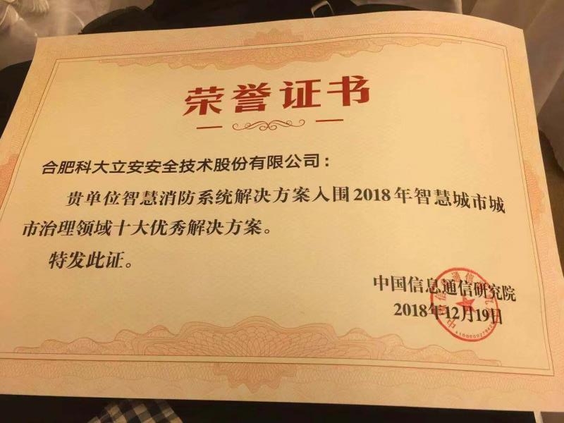 智慧中国,是数字中国发展的高级阶段。树立以人为本、全民参与的智慧社会发展理念,打造集约化信息资源布局、一体化社会共享数据平台,以数据应用为导向、数据治理为重点,构建架构合理、动态适应、高度关联、权责清晰的数据体系,是推动数据政府建设的重要抓手和核心构成,也是当前政府工作重中之重。近日,“2018智慧中国年会”在北京隆重召开,以“数据赋能 智慧中国”为主题,聚焦数字政府、智慧城市、数字经济、互联网+政务服务、营商环境、数据体系、数据服务等内容。合肥科大立安安全技术股份有限公司(以下简称“科大立安”)作为智慧消防系统解决方案提供商,荣获“2018年智慧城市城市治理领域十大优秀解决方案”奖项,公司正加速构建“智慧消防”智能化解决方案,积极推动“智慧消防”在全国各省市智慧城市建设试点中应用。