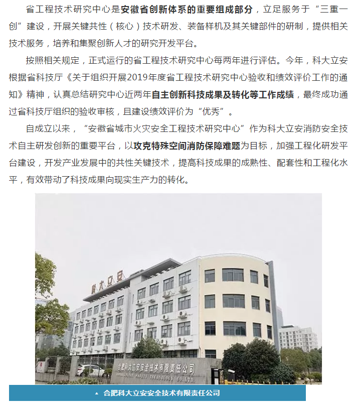科大立安“安徽省城市火灾安全工程技术研究中心” 绩效评价获优!