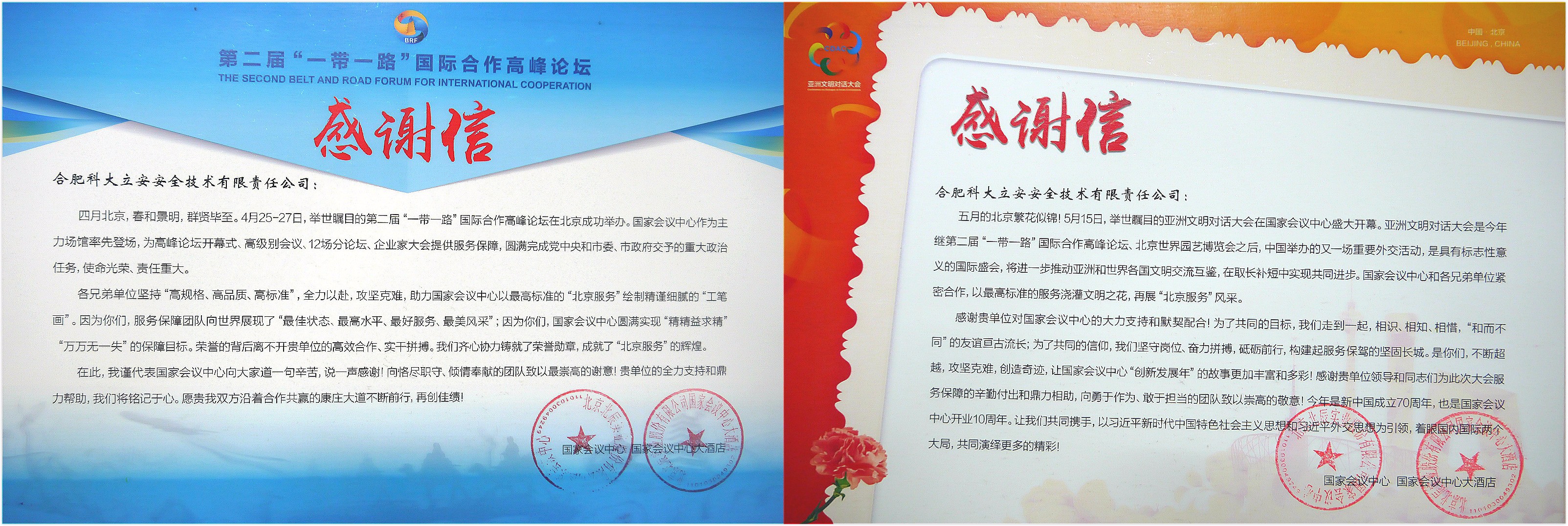 日前,国家会议中心先后向合肥科大立安安全技术有限责任公司发来两封感谢信,以此表彰在第二届“一带一路”国际合作高峰论坛(04.25-04.27)、亚洲文明对话大会(05.15)期间,科大立安作为专业消防安全保障服务团队,为两大高规格国际会议的顺利举办全力以赴、攻坚克难,出色完成保障任务。 作为消防安全一体化综合解决方案提供商,科大立安已经持续12年为国家会议中心提供消防保障服务。感谢信中特别提到,科大立安服务保障团队坚持“高规格、高品质、高标准”要求,助力国家会议中心圆满实现“精精益求精” “万万无一失”的保障目标! 据悉,国家会议中心项目安装的是科大立安大空间火灾报警系...